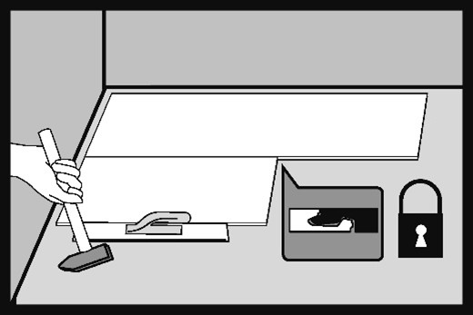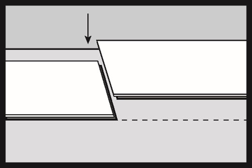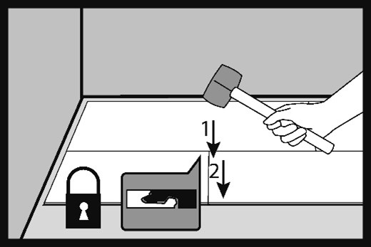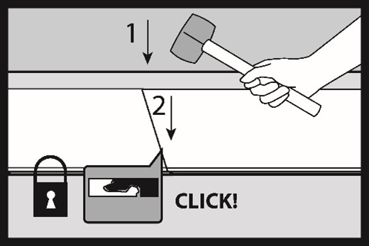 Dobij delikatnie młotkiem nieodbijającym (piaskowy) połączenie krawędzi i zapnij zamek według kolejności dobijania 1 i 2. Przy prawidłowo zapiętym zamku warstwa wierzchnia paneli powinna być w jednej płaszczyźnie a pomiędzy połączonymi elementami nie powinno być widocznej różnicy poziomów.