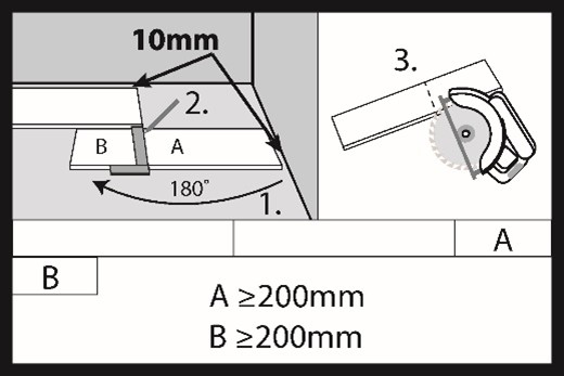 Do cięcia paneli możemy zastosować piłę ręczną lub elektryczną. Pamiętajmy żeby po odcięciu ostatniego panelu zostawić szczelinę dylatacyjną o szerokości minimum 10 mm. Zalecana długość ostatniego dociętego panelu (A) w pierwszym pasie podłogi powinna wynosić min. 200mm. Jeżeli odcięty kawałek (B) ma długość powyżej 200 mm możemy go wykorzystać do rozpoczęcia montażu drugiego pasa podłogi. Odległość pomiędzy połączeniami czołowymi w dwóch sąsiadujących pasach podłogi powinna wynosić minimum 200 mm.