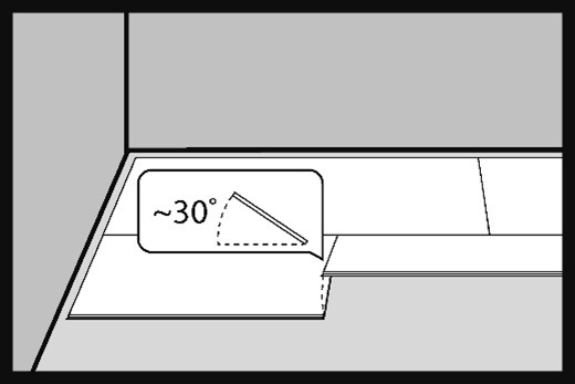 Pierwszy panel SPC w drugim pasie podłogi wkładamy pod kątem ok. 30° w zamek panelu w pierwszym pasie podłogi. Zalecania długość montowanego panelu SPC powinna wynosić min. 200mm.