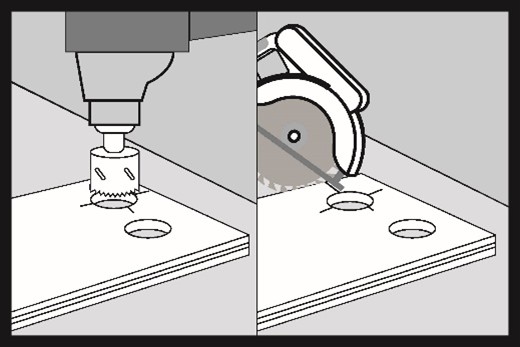 Wycinamy otwory w panelu SPC. Rysujemy linię przez środek otworów i za pomocą piły przecinamy panel.