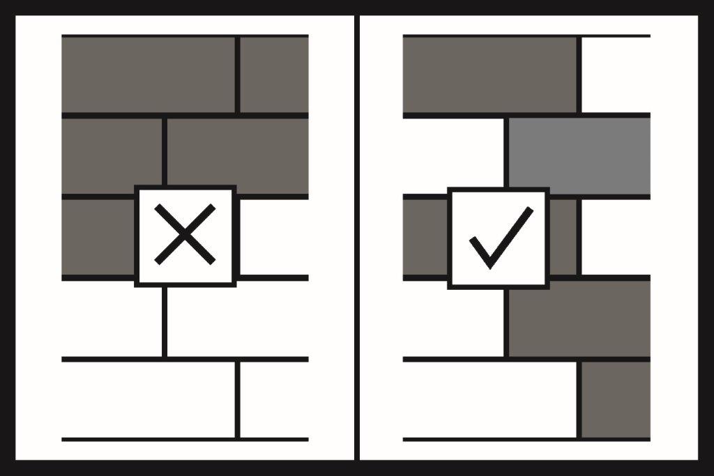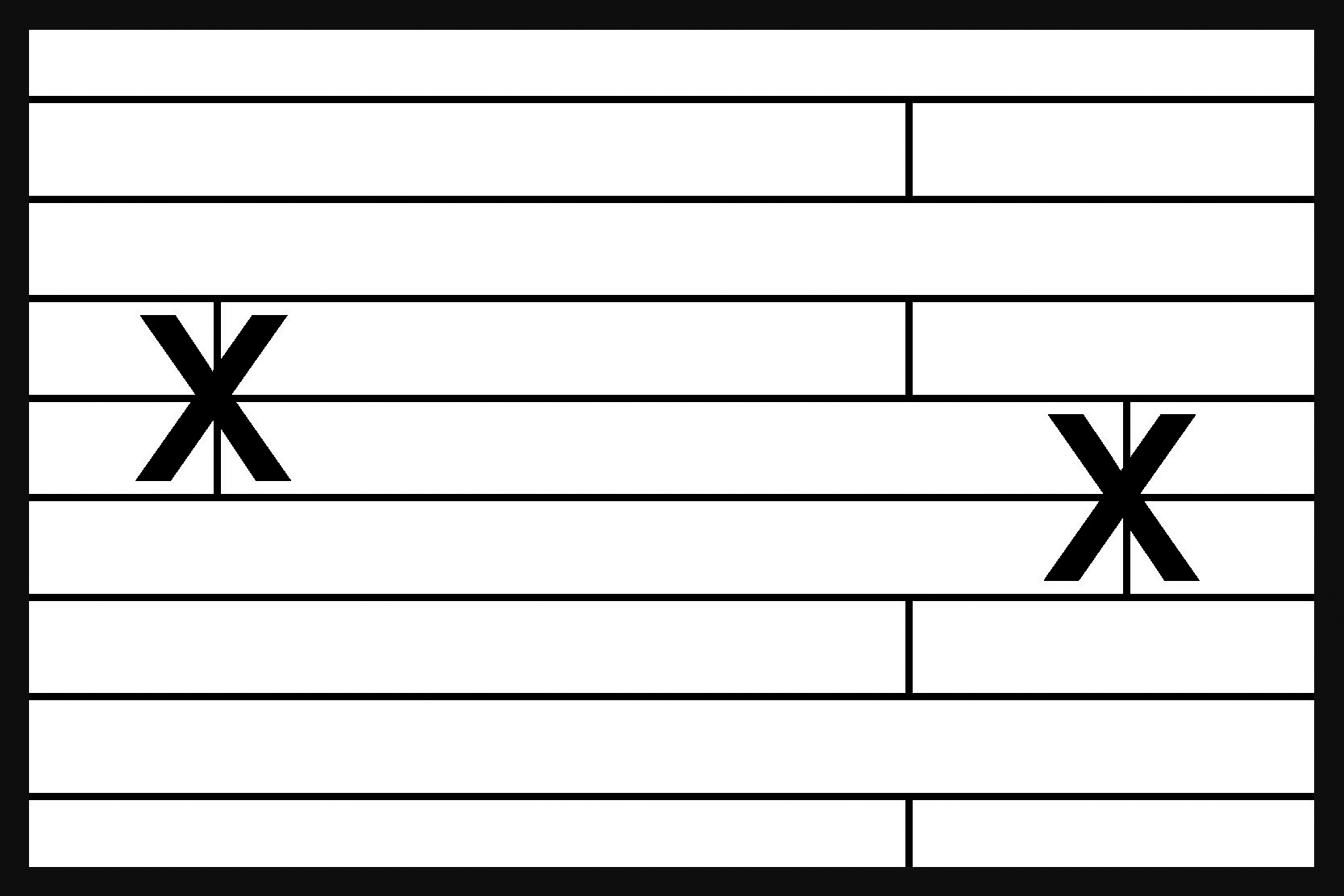 Naturalny układ podłogi uzyskamy mieszając deski o różnych długościach w jednym pasie podłogi. Minimalne zalecane przesunięcie połączeń na krótkich krawędziach paneli SPC w sąsiadujących pasach podłogi musi być większe niż 200 mm.