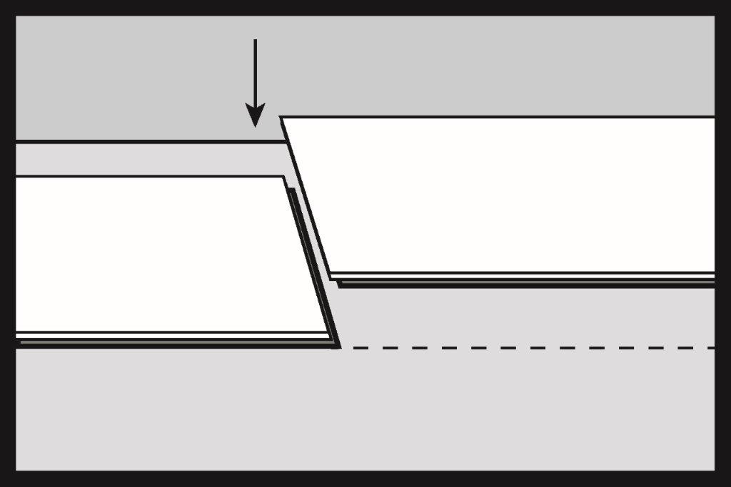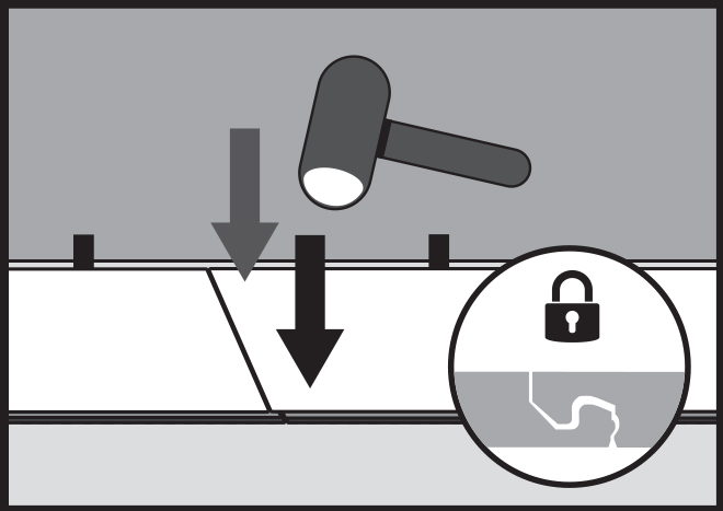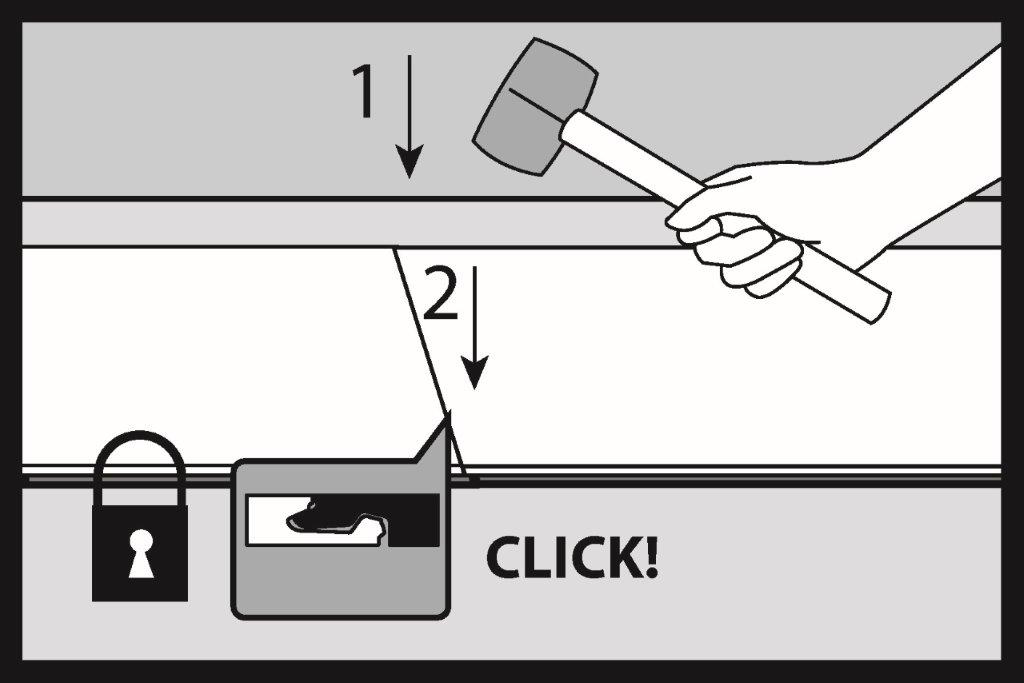 Dobij delikatnie młotkiem nieodbijającym (piaskowy lub z białej gumy) połączenie krawędzi i zapnij zamek według kolejności dobijania 1 i 2. Przy prawidłowo zapiętym zamku warstwa wierzchnia paneli powinna być w jednej płaszczyźnie a pomiędzy połączonymi elementami nie powinno być widocznej różnicy poziomów.