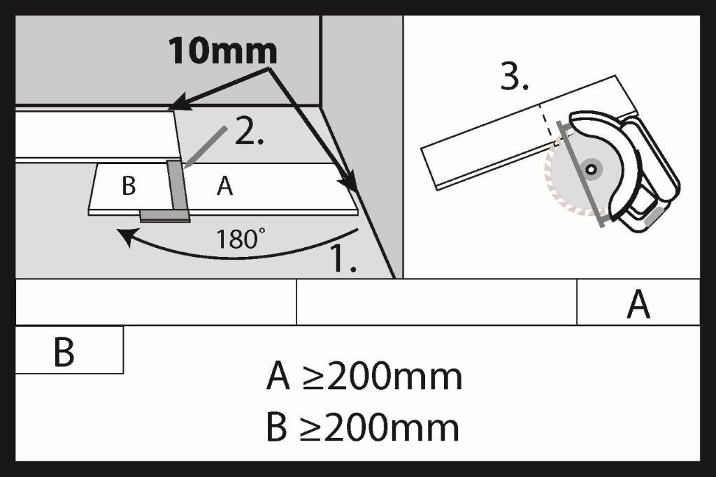 Do cięcia paneli możemy zastosować piłę ręczną lub elektryczną. Pamiętajmy żeby po odcięciu ostatniego panelu zostawić szczelinę dylatacyjną o szerokości minimum 10 mm. Zalecana długość ostatniego dociętego panelu (A) w pierwszym pasie podłogi powinna wynosić min. 200 mm. Jeżeli odcięty kawałek (B) ma długość powyżej 200 mm możemy go wykorzystać do rozpoczęcia montażu drugiego pasa podłogi. Odległość pomiędzy połączeniami czołowymi w dwóch sąsiadujących pasach podłogi powinna wynosić minimum 200 mm.