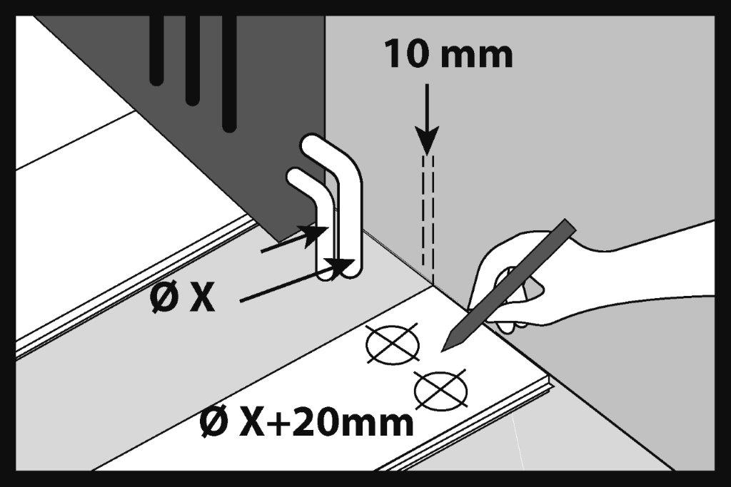 Przy rurkach od kaloryferów w panelu SPC musimy narysować otwory o średnicy większej o 20 mm.