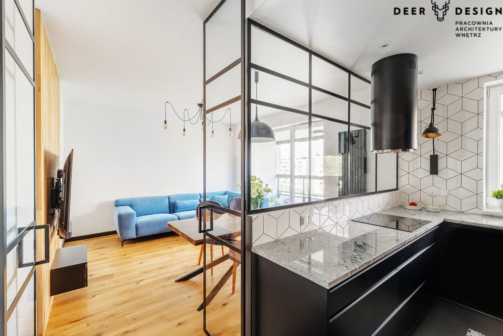 Salon z aneksem kuchennym stanowi coraz popularniejsze rozwiązanie zwłaszcza w małych mieszkaniach. Takie rozwiązanie wprowadza do wnętrza więcej przestrzeni i światła. Część kuchenna i salonowa mogą być w pełni ze sobą połączone lub oddzielone na przykład wyspą lub przeszkleniami jak w projekcie biura Deer Design. Ciepło nowoczesnego wnętrza zapewnia Deska Barlinecka Dąb Raisins Grande.