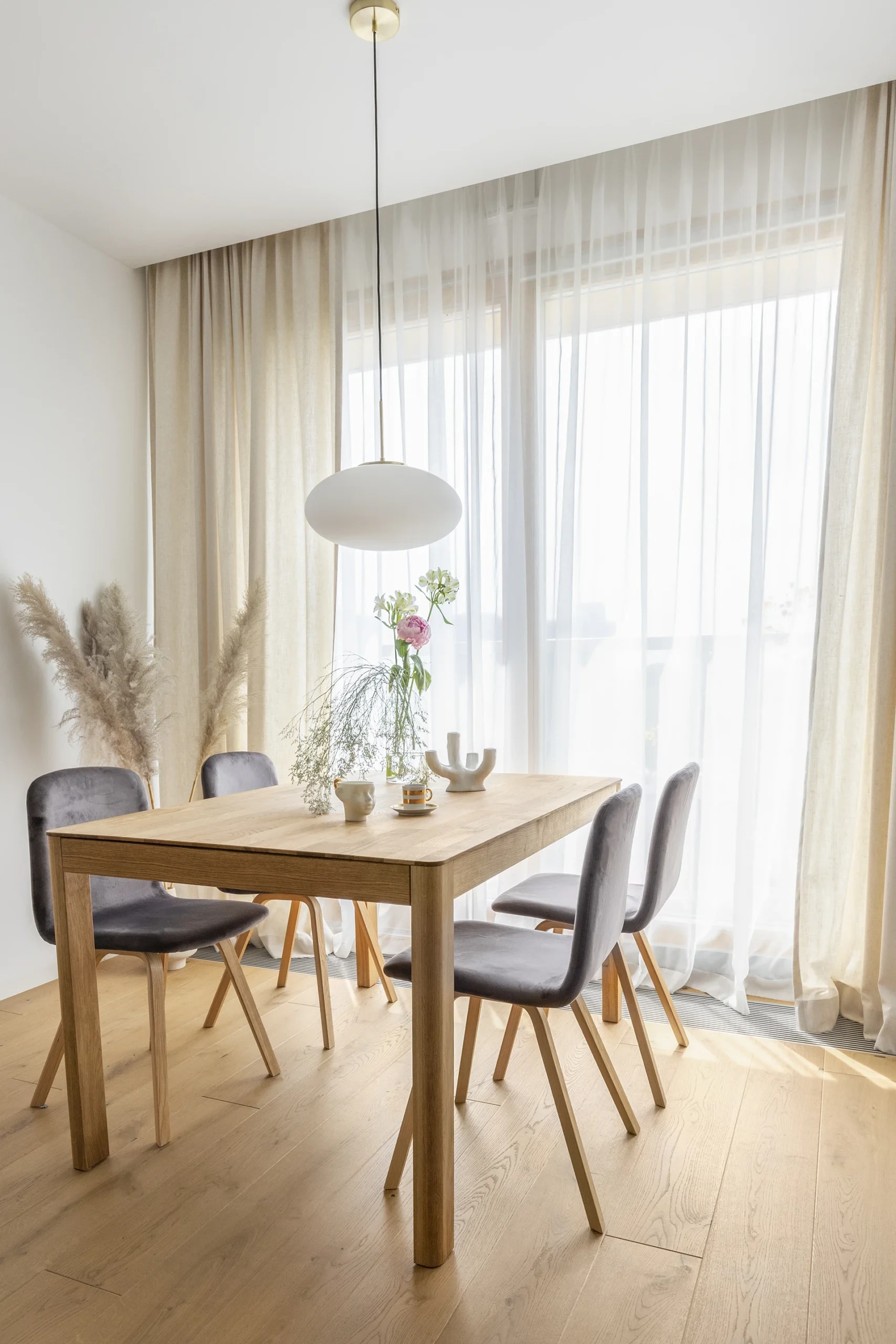 Aranżacja zachwyca spójnością, lekkością i ponadczasową elegancją, tworząc przestrzeń idealnie dopasowaną do nowoczesnego stylu życia. Naturalne drewno, jasna paleta barw i miękkie tkaniny budują ciepłą, harmonijną atmosferę, a starannie dobrane detale dodają wnętrzu wyrafinowanego charakteru. To wnętrze, które łączy estetykę z funkcjonalnością i zaprasza do codziennego celebrowania domowej wygody. Projekt: Decoroom.