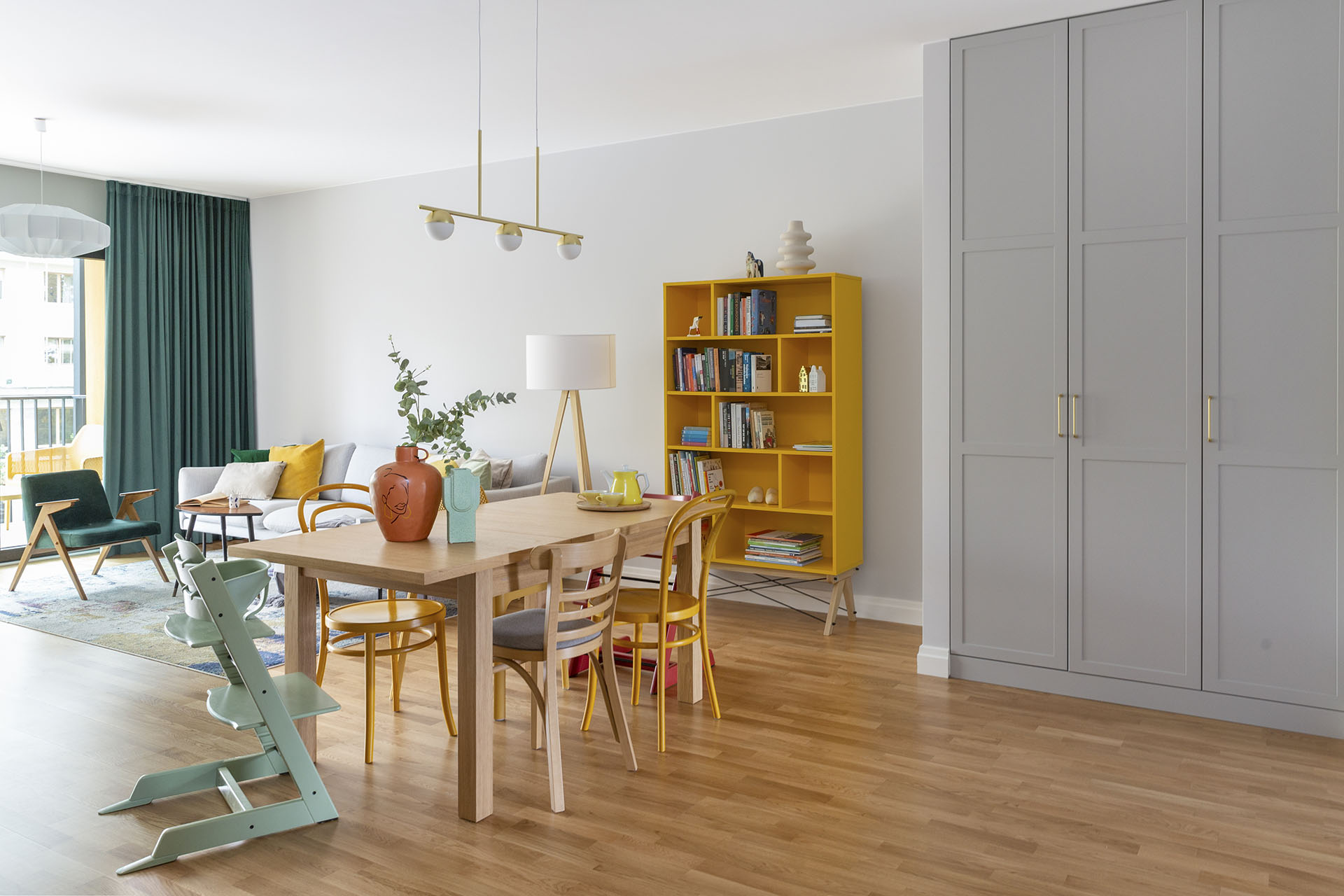 Położone na warszawskim Żoliborzu mieszkanie urządzone zostało z myślą o 4-osobowej rodzinie. Ponadczasowe, łagodne szarości stanowią neutralne tło dla kolorowych dodatków i Deski Barlineckiej na podłodze. Połączenie kuchni z jadalnią w stylu skandynawskim.