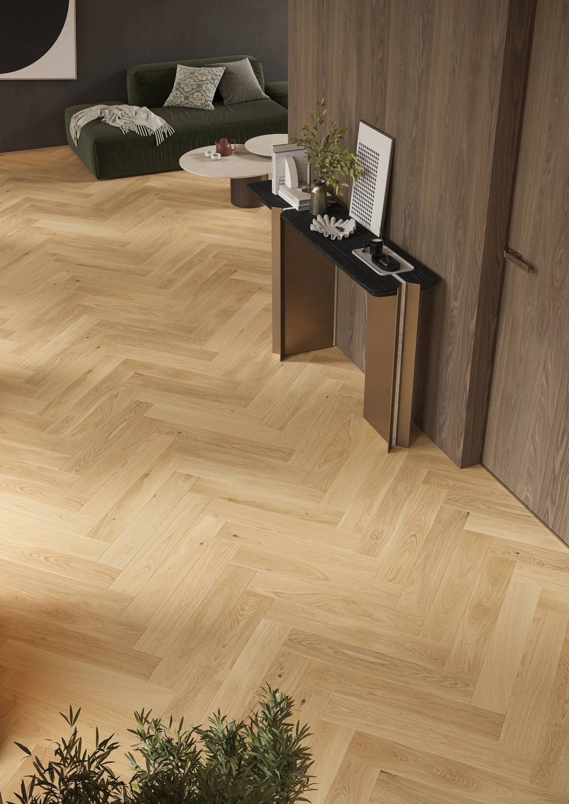 Podłoga dębowa z subtelnie zaakcentowaną niedużą ilością cech drewna. Naturalny rysunek słoi i głębia barwy uwydatniony zabiegiem szczotkowania, a 4-stronna mikrofaza podkreśliła jej charakter. Wykończona lakierem matowym.