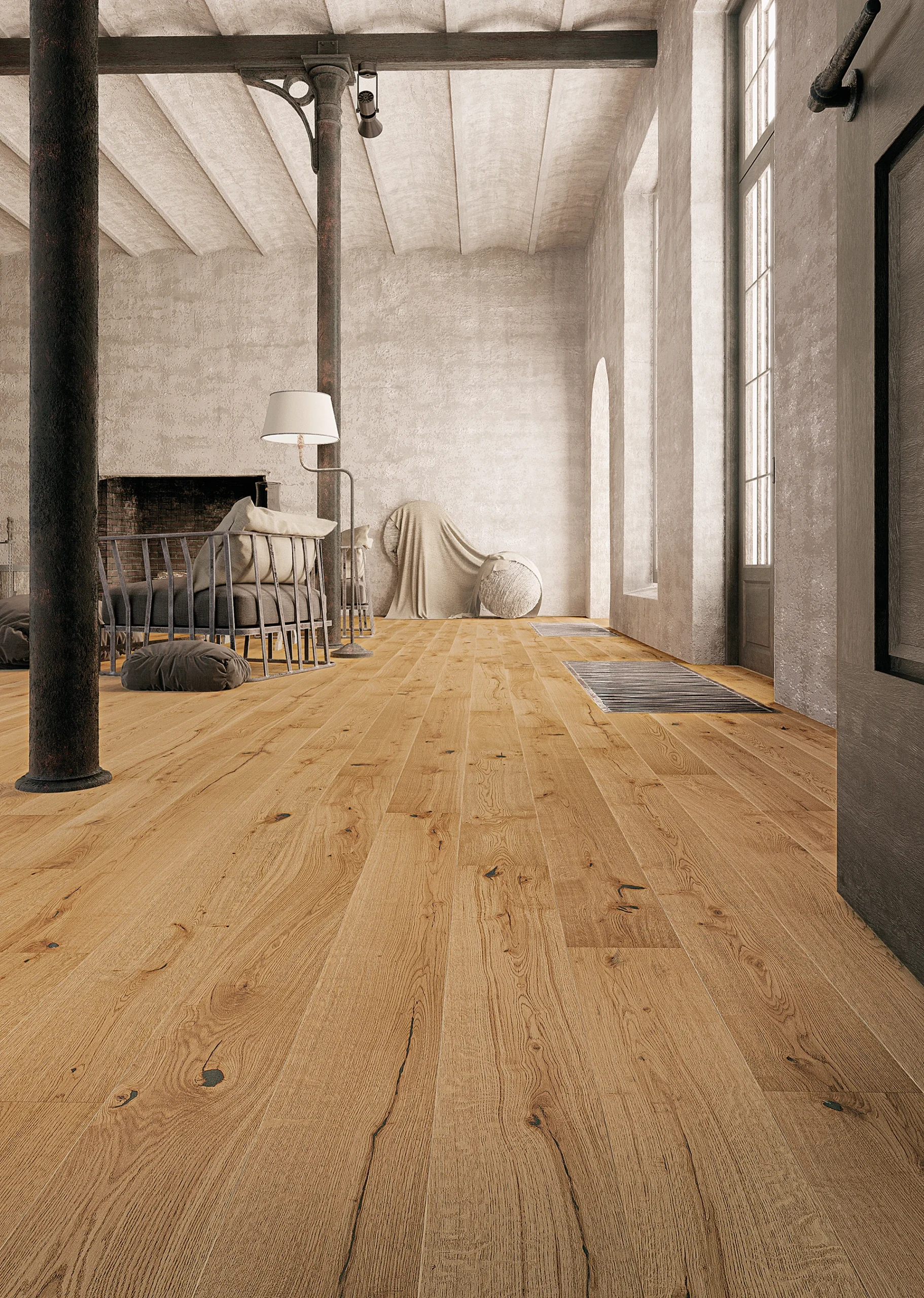 Podłoga dębowa 1-lamelowa o szerokości 207 mm i długości 2200 mm wykończona olejem naturalnym o jasnobrązowym odcieniu. Deski z wyraźnie ściętymi dłuższymi krawędziami (fazowanie), struktura drewna podkreślona szczotkowaniem.