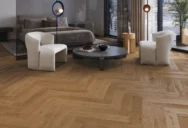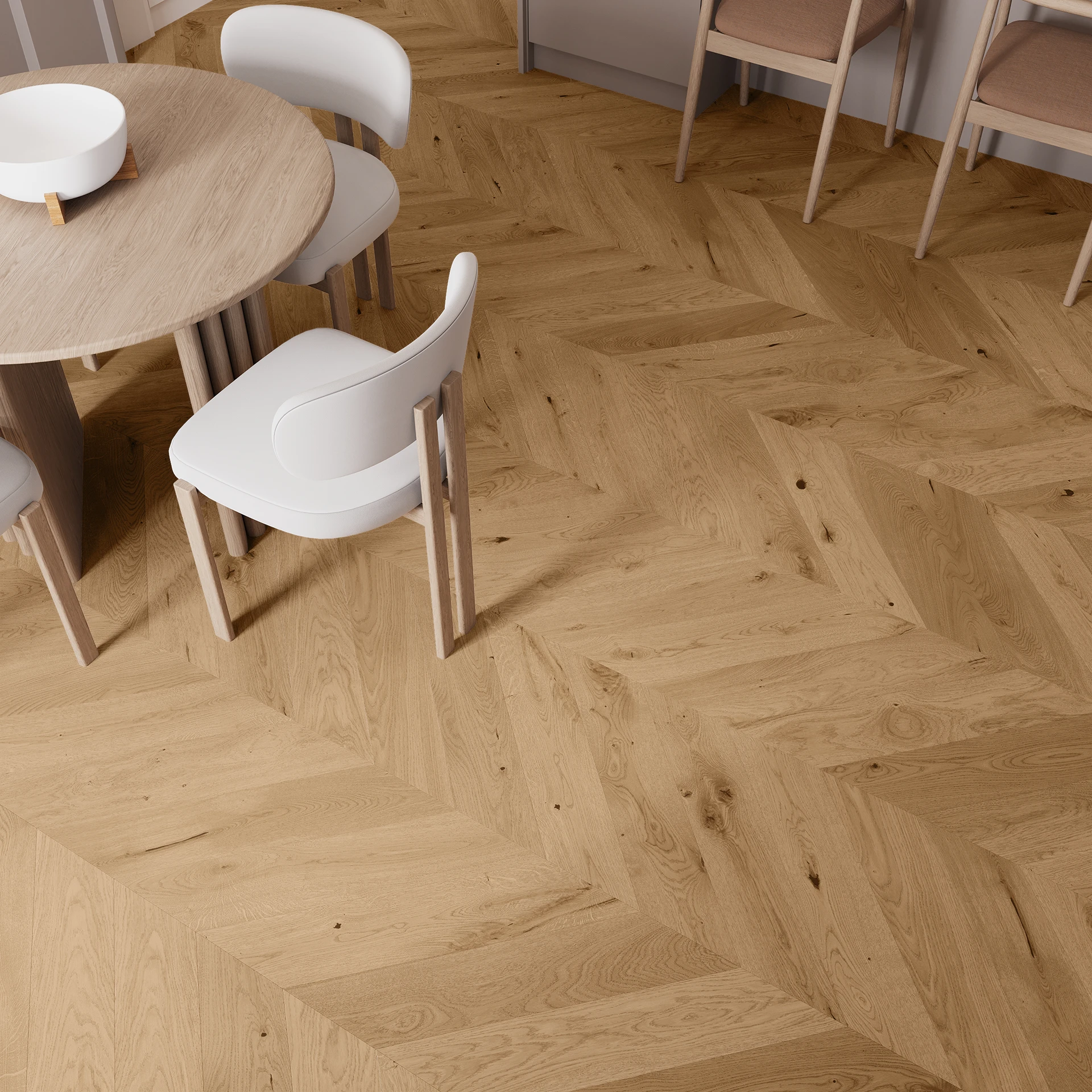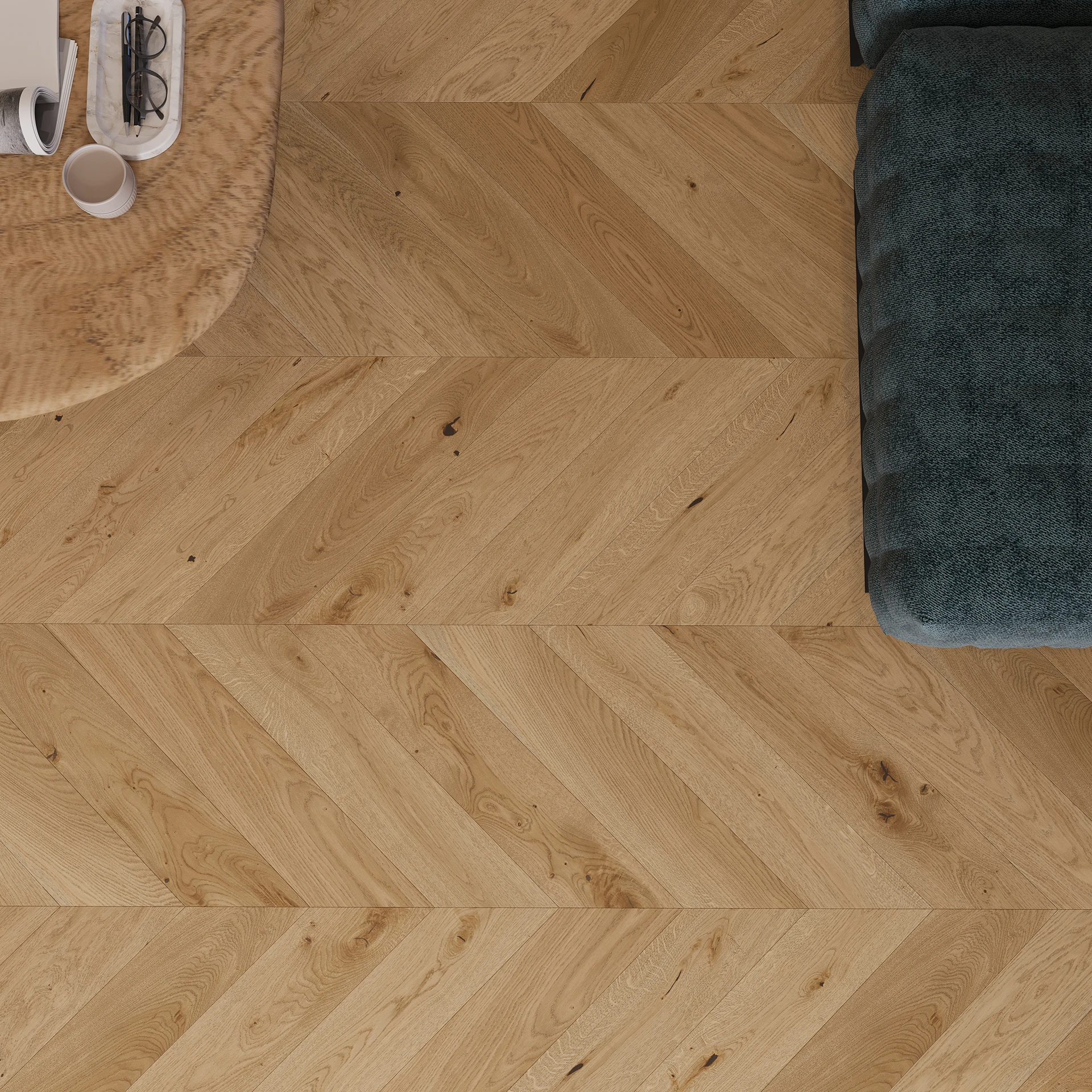 Deska dębowa o mocno wyeksponowanych cechach drewna i przyjemnym odcieniu ciepłego brązu. Podłoga poddana procesom szczotkowania i fazowania, dzięki którym zostały podkreślone struktura oraz forma. Wykończona lakierem matowym.