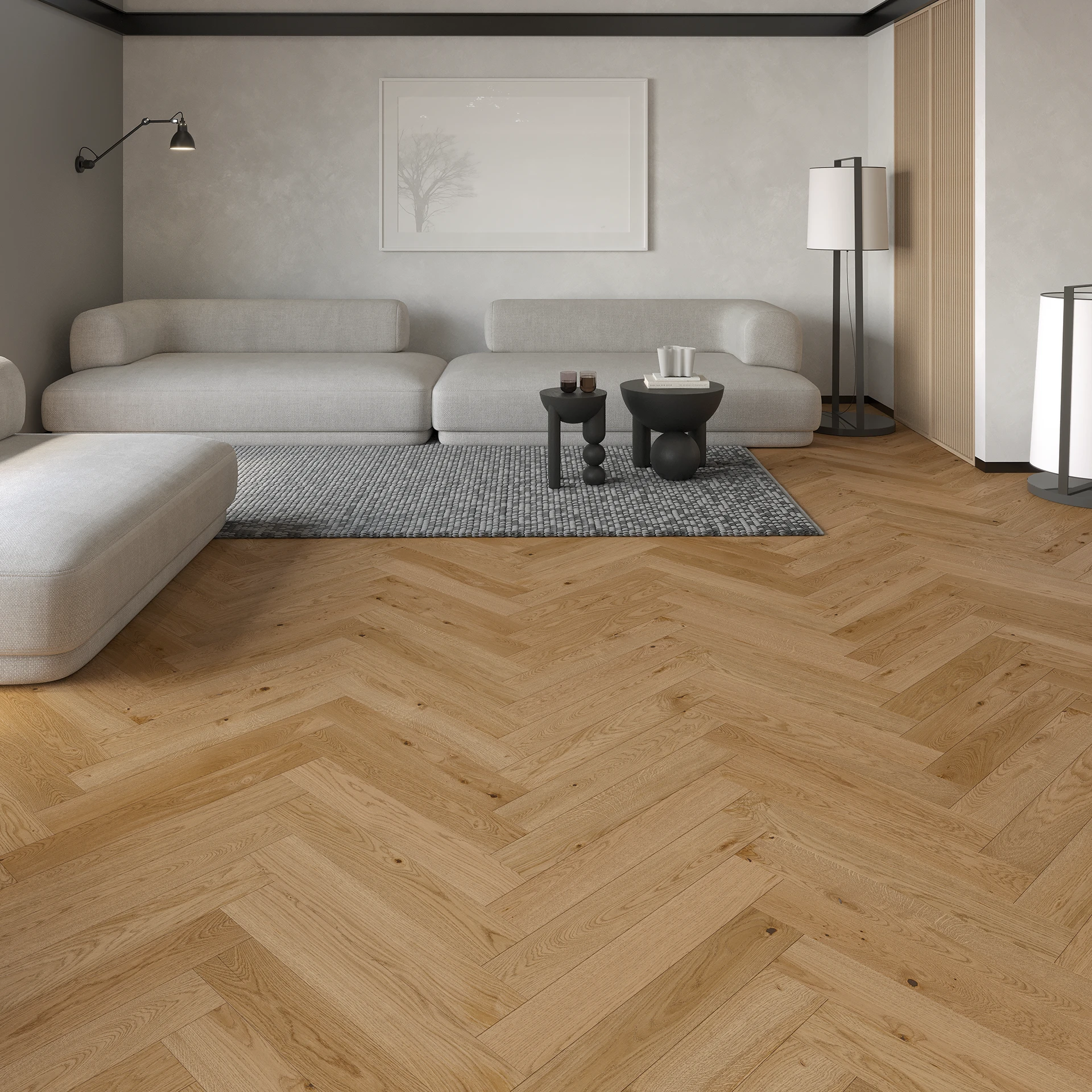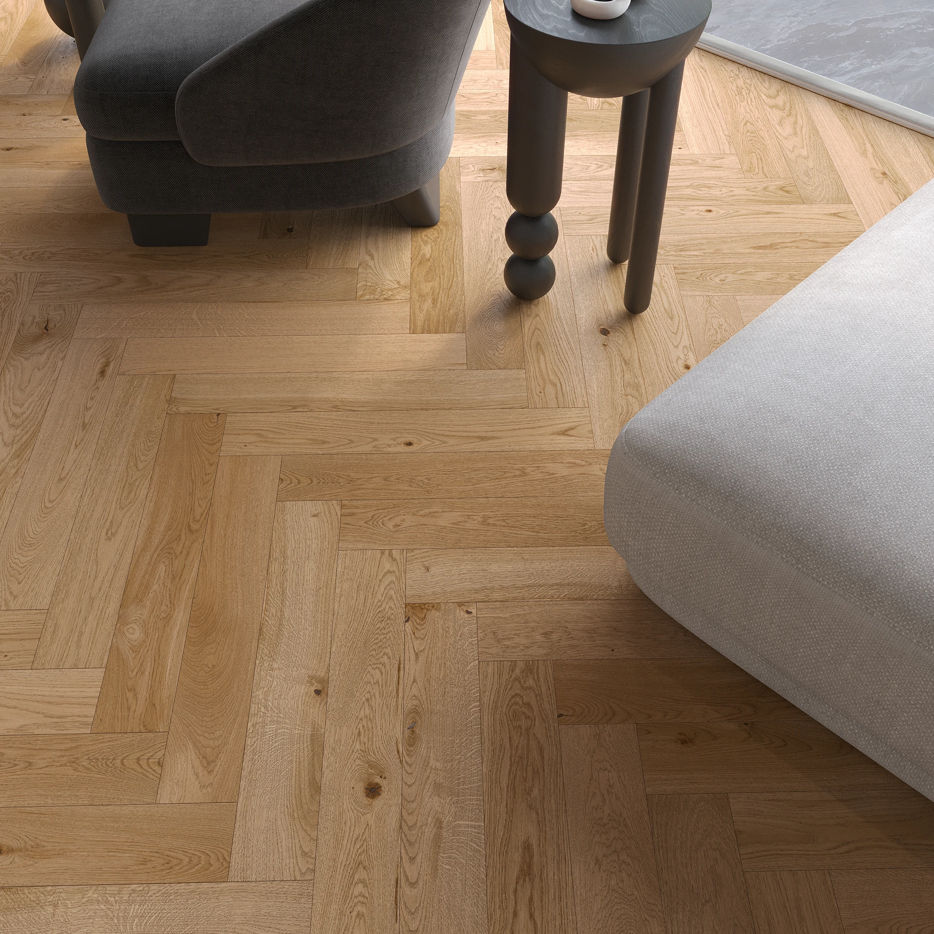 Podłoga dębowa o barwie ciepłego brązu i mocno zaakcentowanych cechach drewna. Rysunek słoi został uwydatniony dzięki szczotkowaniu, a 4-stronna mikrofaza dodatkowo uszlachetniła podłogę. Pokryta lakierem matowym.