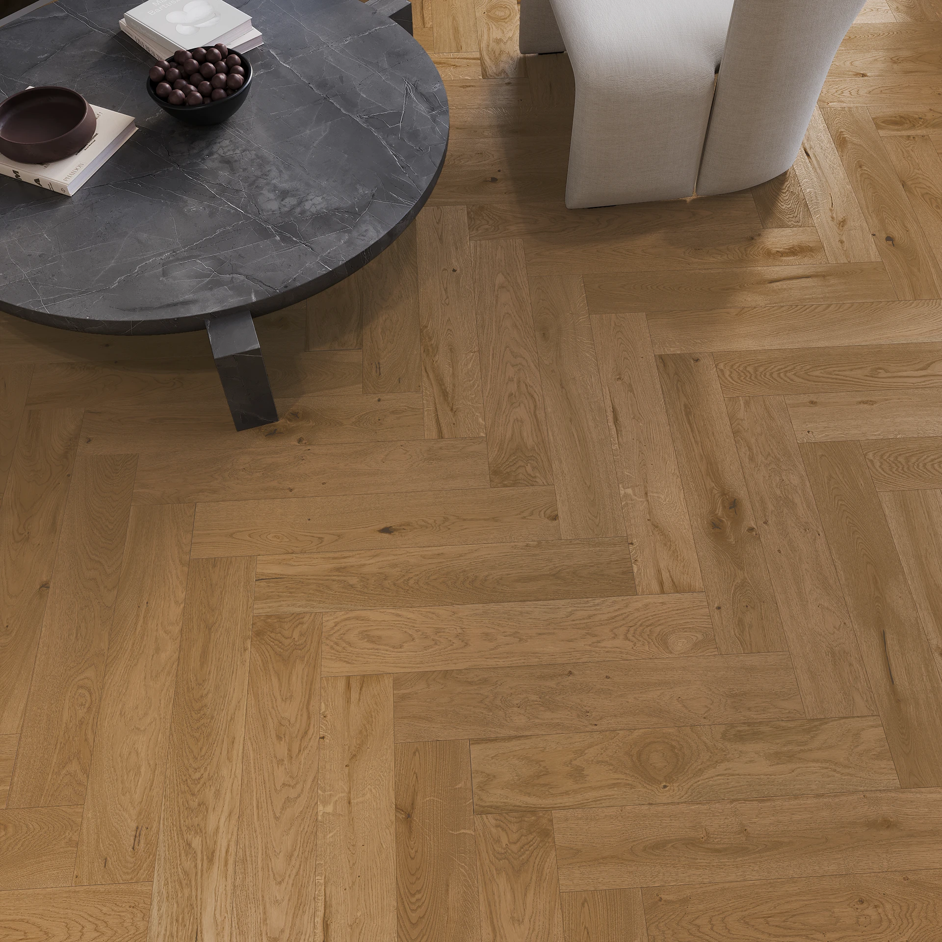 Deska dębowa o mocno wyeksponowanych cechach drewna i przyjemnym odcieniu ciepłego brązu. Podłoga poddana procesom szczotkowania i fazowania, dzięki którym zostały podkreślone struktura oraz forma. Wykończona lakierem matowym.