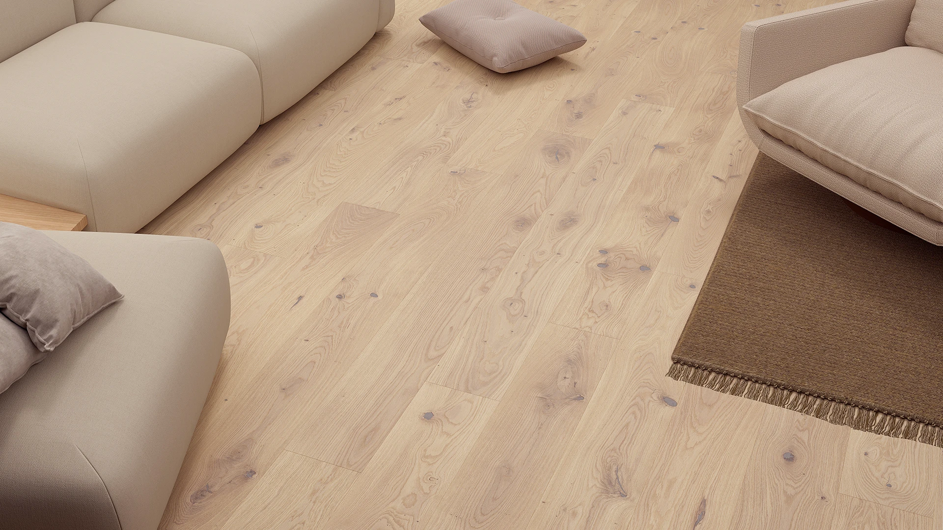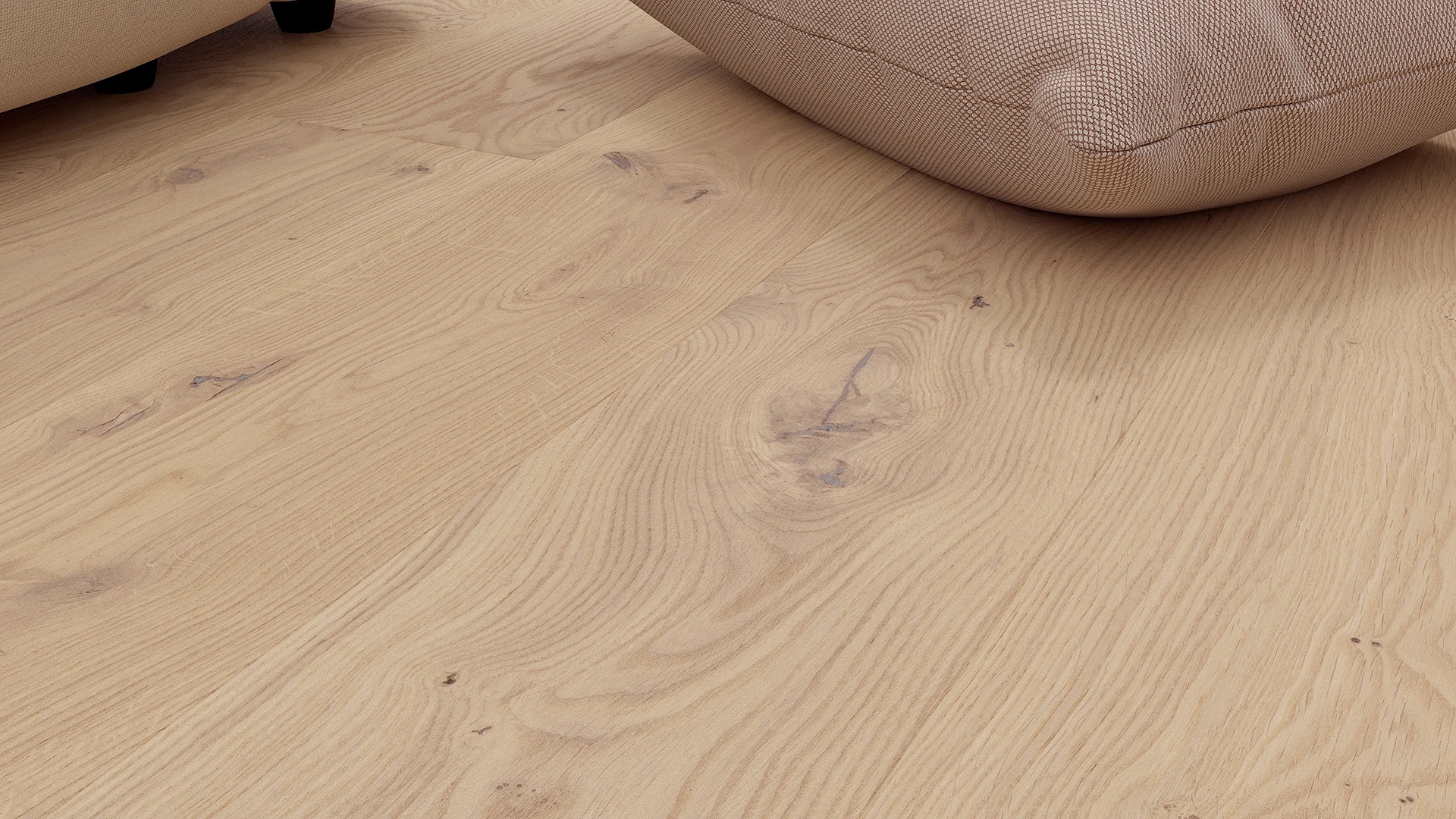 Podłoga dębowa 1-lamelowa o szerokości 207 mm i długości 2200 mm pokryta matowym olejem naturalnym o kremowym zabarwieniu. Duża ilość naturalnych cech drewna nadaje podłodze Sense rustykalnego wyglądu. Dwustronne fazowanie optycznie wydłuża deskę i podkreśla jej naturalność.
