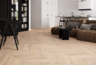 Podłoga dębowa o delikatnym, kremowo-białym barwieniu. Deski uszlachetnione szczotkowaniem i zabezpieczone lakierem matowym.