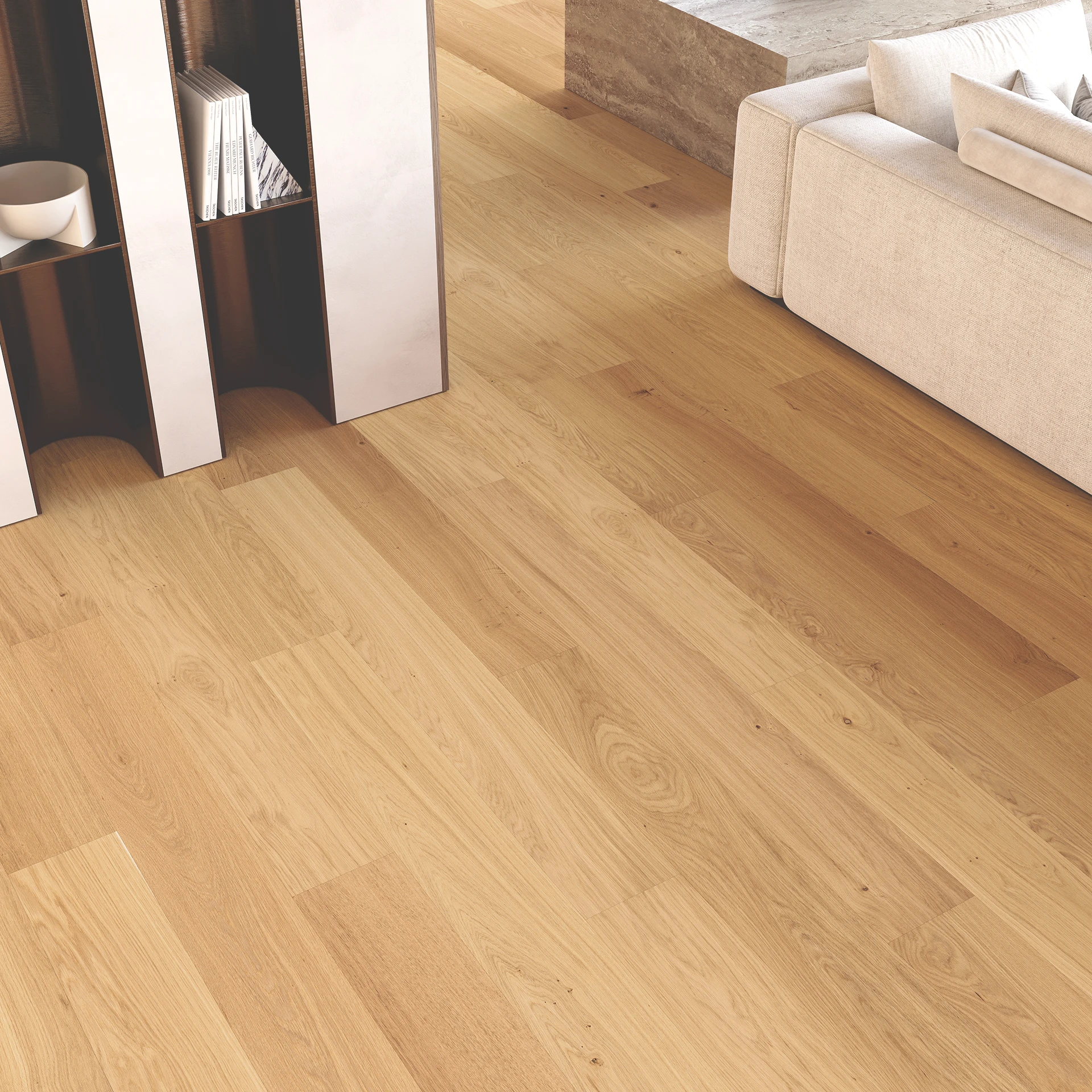 Naturalna dębowa podłoga z delikatnie podkreślonymi cechami drewna. Szczotkowana powierzchnia pięknie uwydatnia rysunek słojów, nadając podłodze autentyczny charakter i szlachetny wygląd.
