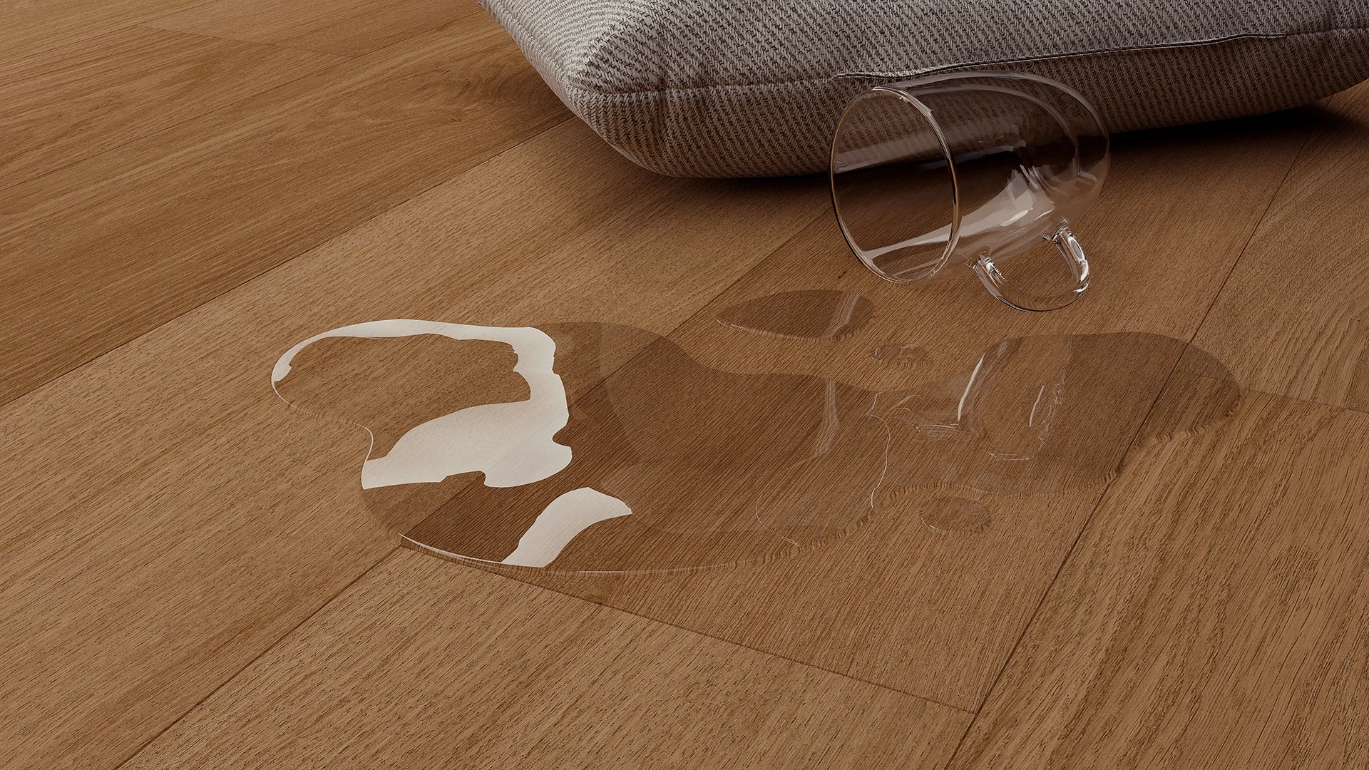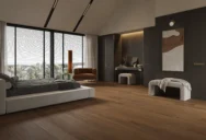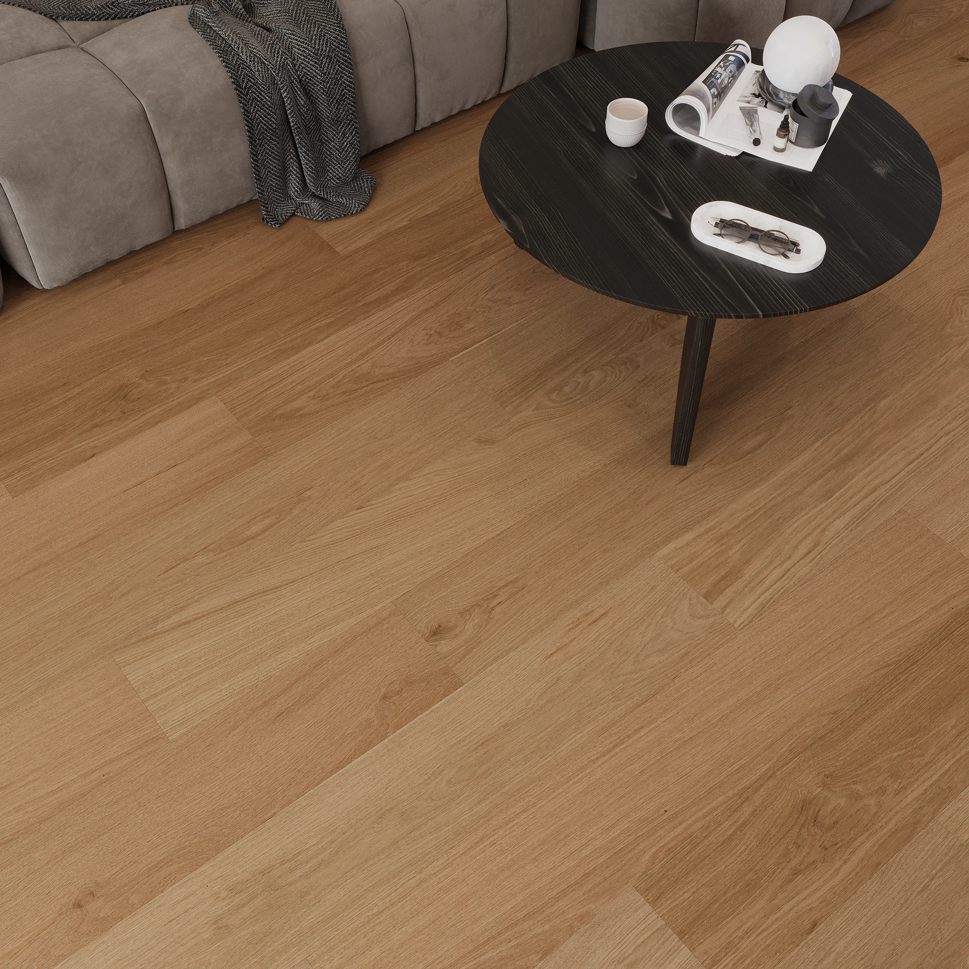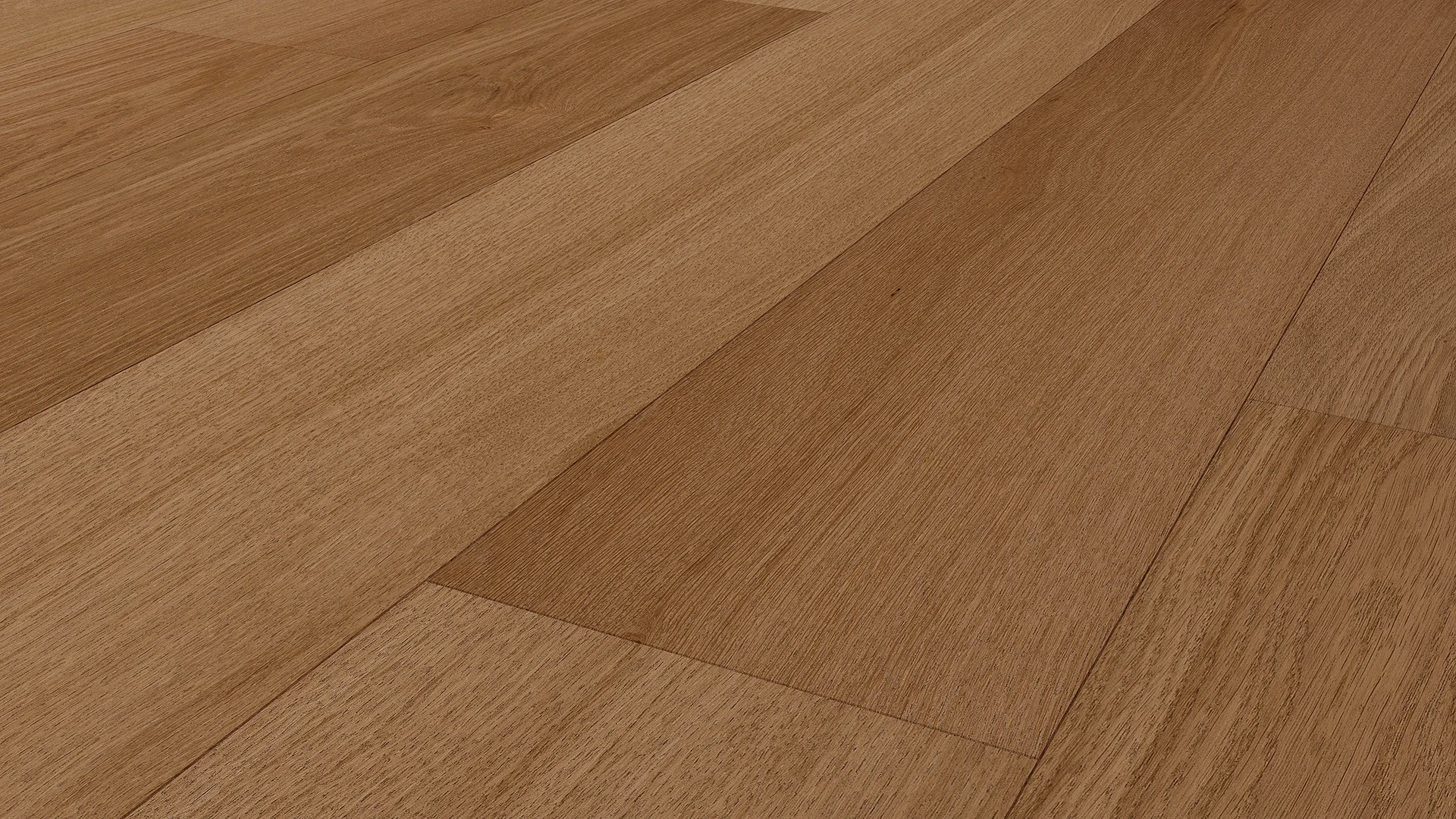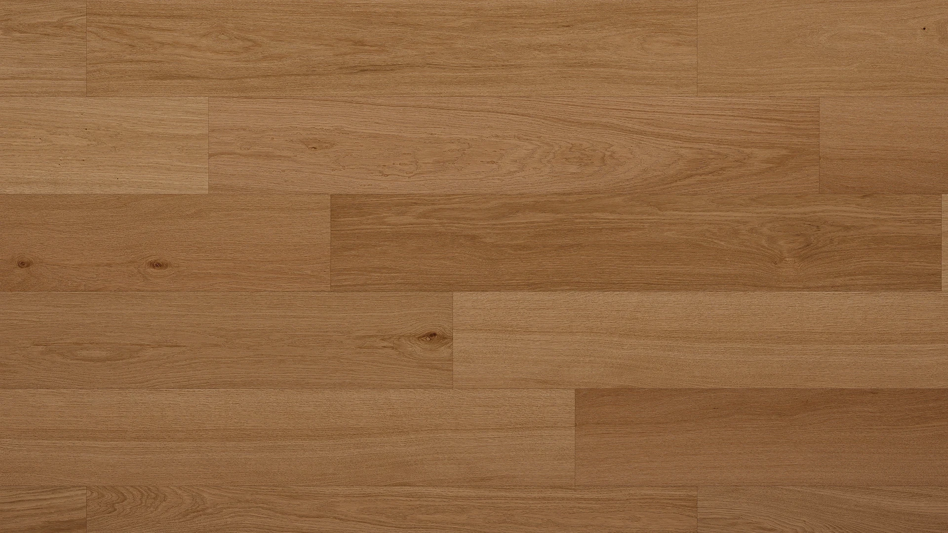 Dębowa podłoga w ciepłym, jasnym brązie wprowadza do wnętrza naturalny i przytulny klimat. Subtelnie przyciemnione drewno podkreśla charakter dębu i jego delikatne usłojenie.