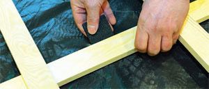 Pod tak przygotowaną konstrukcję krzyżową musimy podłożyć podkładki elastyczne. Podkładki o wymiarach 15 mm x 75 mm x 75 mm wykonane są ze sztucznego tworzywa o współczynniku sprężystości przy ściskaniu Ec = 2,85 N/mm2 oraz gęstości 730 kg/m3. Podkładki elastyczne podkładamy pod dolny legar w połowie rozstawu pomiędzy połączeniami z legarami warstwy górnej.
