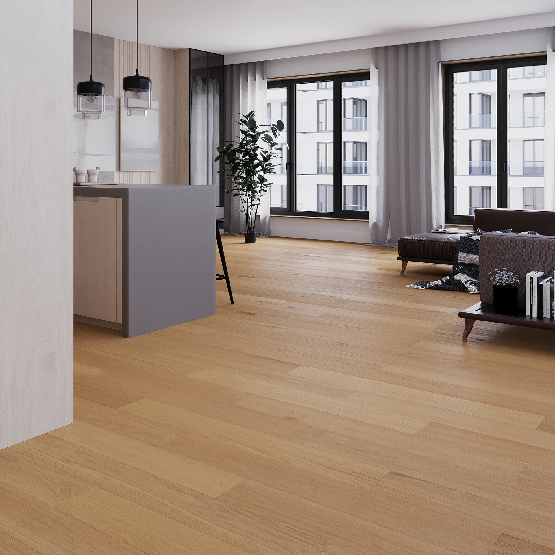 podłoga wykonana ze starannie wyselekcjonowanego drewna, którego charakter został subtelnie podkreślony procesem szczotkowania